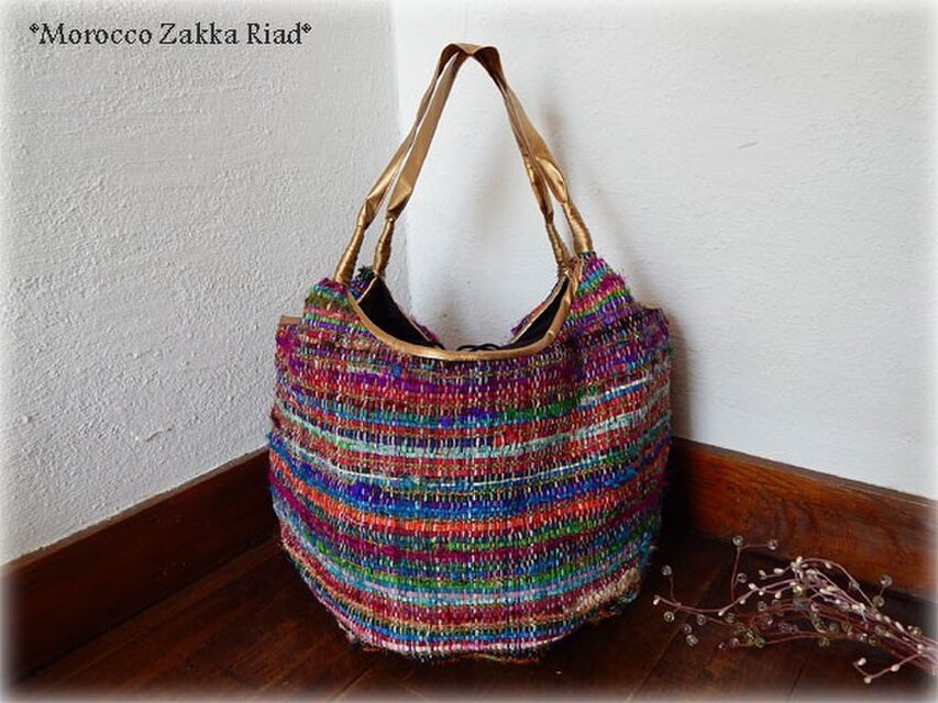 ネパールのシルクサリーを使った裂き織生地で作りました。ビビットな色合いが元気をくれます。