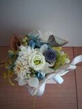 グリーンに白、落ち着いたブルーの優しい雰囲気のアレンジです。