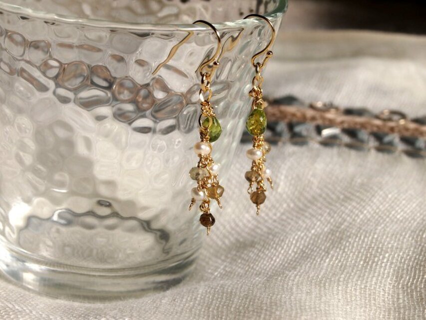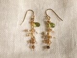 宝石質のペリドット、淡水パール、スモーキークォーツのチャームをつけたピアスです。