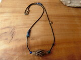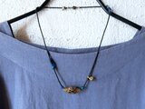 あちこちのブルーの中粒ビーズを集めたものと小さなインドの真鍮の民族ビーズ(チャーム)をポイントにしました。