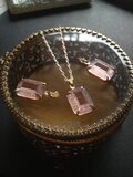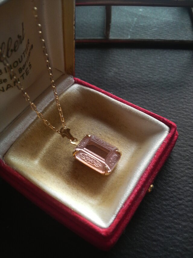 チェコスロバキア・ヴィンテージ、14×10ミリのフロスト・ロザリンカラーの美しいアールデコdesignのGlassカボションでお作りしましたネックレスです。