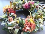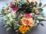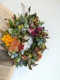 薄い花びらが幾重にも重なった豪華なラナンキュラスと、あじさい、キンポウジュ、コニファー、タタリカなどをアレンジしたアンティーク色のナチュラルなリースです。