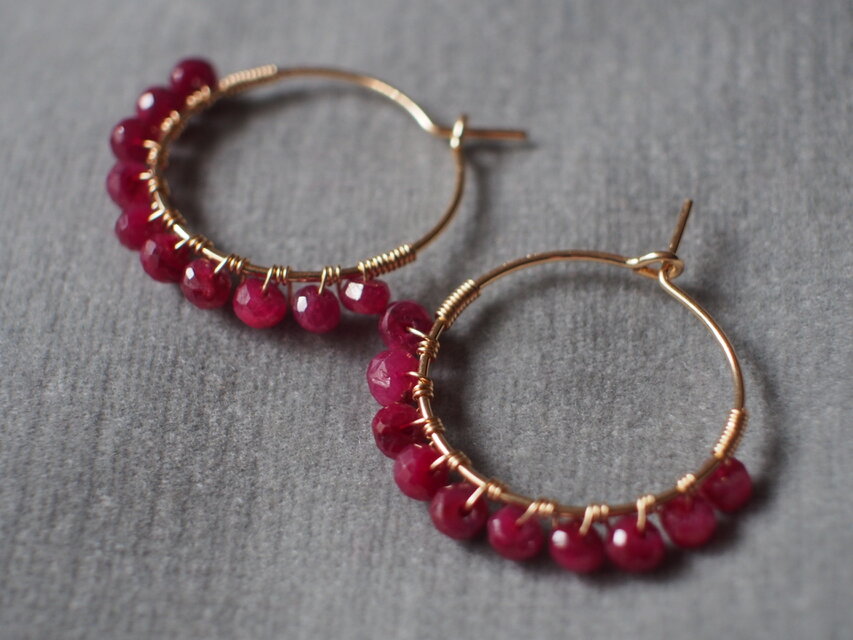 14kgf きらきらボタンカットルビーのフープピアス k14gf