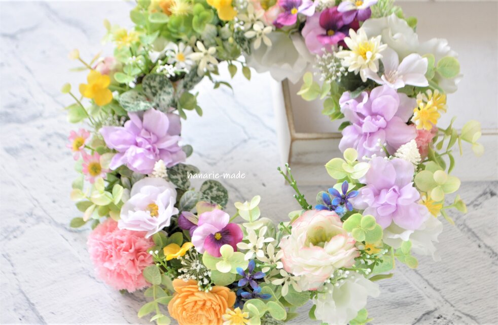 リースサイズ(縦・横・高さ 約 ㎝)26/26/8 リース土台:ナチュラル素材 直径約20センチ リース素材:アーティフィシャルフラワ-(造花):すみれ・ストック・カーネーション・ラナンキュラス・小花・レースフラワー・ユーカリ、など。自然素材:ソラローズ、など。