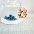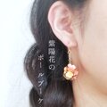 紫陽花の時期は梅雨ですが、晴れの日に着ければ春らしい軽やかな色合いの花束のように見え、雨の日に着ければ、少しノスタルジックで落ち着いた色合いの花束に見える素敵なピアスです。