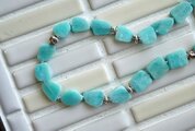 石をスライスして表面を研磨したアマゾナイト、並べてつなぐと石の形がさまざまで、自由な感じをお楽しみいただけます。お色がとても爽やかで美しく、ミントグリーンに近い感じと言ったらいいでしょうか。