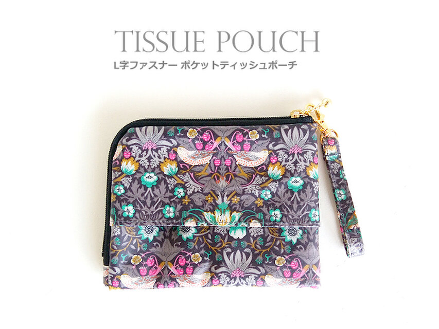 リバティの人気生地、Strawbery Thief ストロベリーシーフ(ブラウン)のラミネート生地(つや無)でL字ファスナーのティッシュポーチを作りました。