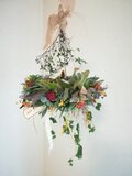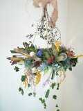 ミモザ、カーネーション、ラナンキュラス、バラ、あじさい、ププレリューム、ブルーアイスなどたくさんのお花や実、葉などをアレンジしたナチュラルなリースです。