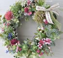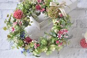 リースサイズ(縦・横・高さ 約 ㎝)26/27/9 リース土台:ナチュラル素材 直径約20センチ リース素材:アーティフィシャルフラワ-(造花):アストランティア・ふうせんポピー・アリウム・ユーカリ・ピンクの実・小花・ハートカズラ、など。自然素材:ソラカーネーション、など。その他:コットンリボン飾り(取り外しできません)。