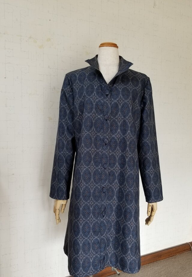 抽象草花模様織り出し本場泥大島紬(絹)からコートワンピースを作りました。