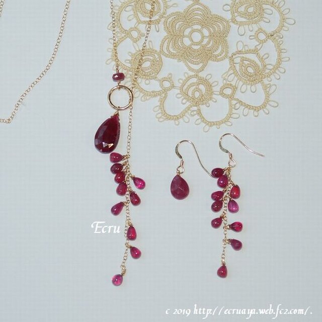 片方には1x0.8センチのルビーを下げ、もう片方にはネックレスと同じドロップを10個下げました。