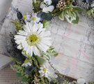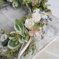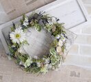 春を迎え、若葉がが成長し次々と花を咲かせていくガーデンを思い浮かべながら製作しました。白い花とグリーンの清楚な雰囲気のリースです。主役にプリザーブドフラワーのガーベラを据え、小ぶりの白バラやアジサイを添えました。グリーンにプリザーブドフラワーのミモザとストーべをあしらい、そのツブツブ感がナチュラルな可愛さを出しています。