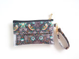 リバティの人気生地、(ビニールコーティングつや無)、 Strawbery Thief ストロベリーシーフ(ブラウン)で開けなくても中身が見える便利なポケット仕切り入り、クリアポーチ(カードサイズ)を作りました。