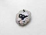 黒のシードビーズでAのイニシャルを刺し、マザーオブパールや淡水パールなどでデコレーションしました。