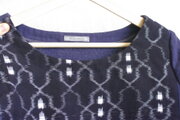 黒に近い濃紺地に白色でクリオネのような模様が織られた久留米絣と