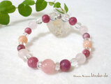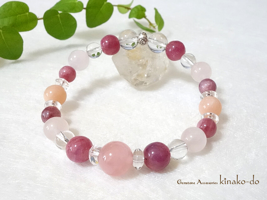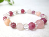 薔薇を想わせる華やかなピンクカラーの高品質ディープローズクォーツ、しっとりとしたレッドカラーが美しいルビー、ピンク~パープルカラーが上品なピンクトルマリン、可愛らしいパステルピンクの上質なピンクオパール、柔らかな色合いのローズクォーツを組み合わせた天然石ブレスレットです。