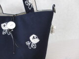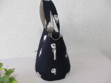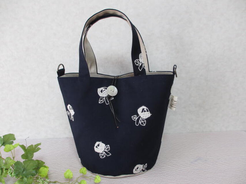 紺地に白いバラが点在したキュートな生地でバケツ型トートを作成しました。