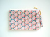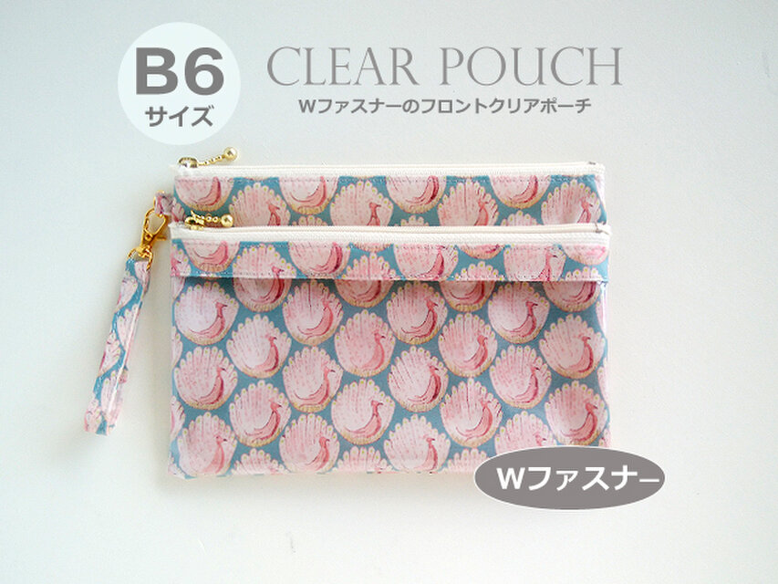 リバティの人気生地、(ビニールコーティングつや無)、 Peacocks of Grantham Hall ピーコックス・オブ・グランサム・ホール(水色)便利なWファスナーのフロントクリアポーチ(B6サイズ)を作りました。