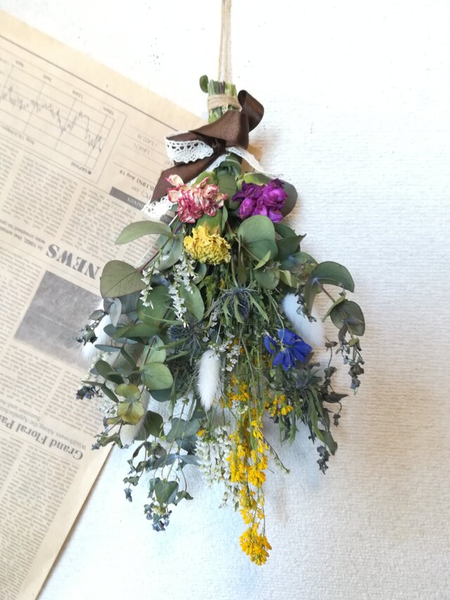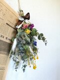 黄色、マーブル模様、バイオレットの三色のカーネーションと、タタリカ、春のお花菜の花、ラグラス、エリンジュウム、デルフィニウムなどをアレンジしたユーカリがほのかに香るスワッグです