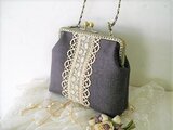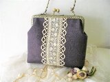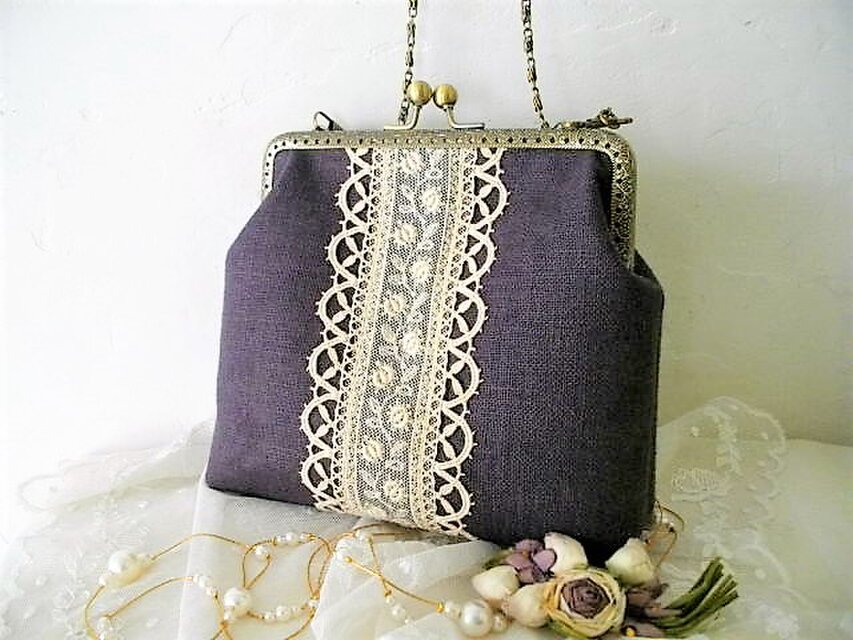 シックな色合いのパープルリネンにアンティークの刺繍チュールレースとボビンレース