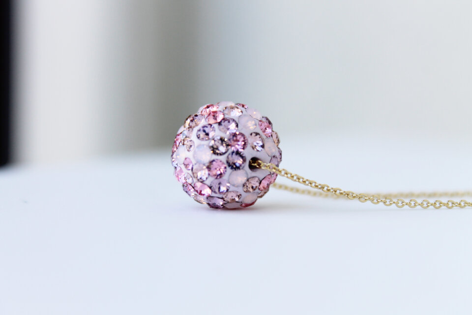 つけるだけでプリンセス気分になれるような華やかで優しいラベンダーピンク色のスワロボールネックレスです。
