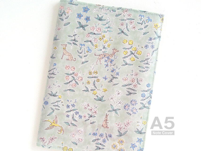 リバティの人気生地、ミルフルール Mille Fleurs(アイスミント)のラミネート生地(つや無)でA5サイズのノートカバーを作りました。