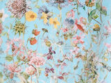 『英国の花図鑑』のイラストから着想を得てデザインされた柄です。繊細なタッチの植物画がデジタルプリントで写実的に表現されています。生地の地の色がライトブルー、花の色がピンク、ブルー、イエロー、オフホワイトなどです。葉の色が濃淡のあるライトグリーンです。