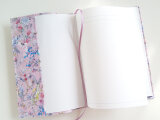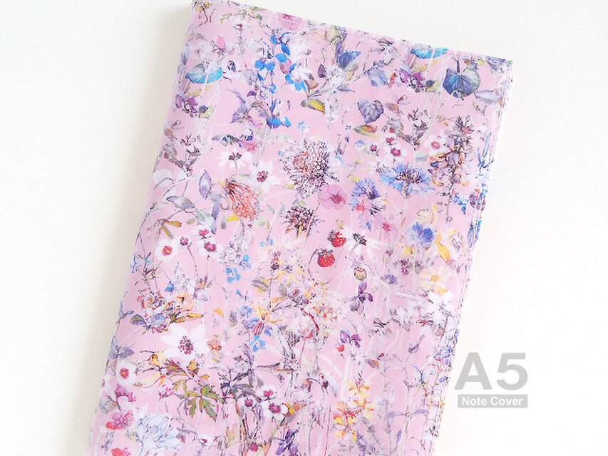 リバティの人気生地、ワイルドフラワーズ Wild Flowers(ピンク)のラミネート生地(つや無)でA5サイズのノートカバーを作りました。