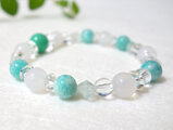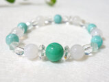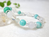天然色のグリーンカルセドニー・アマゾナイト・ホワイトカルセドニー・グリーンフローライトを組み合わせた天然石ブレスレットです。恋愛関係をはじめ、人間関係において素敵な出会いを引き寄せて絆を深めるパワーがあるので「良縁を呼ぶ」組み合わせと云われています。 また、マイナスエネルギーやストレスを取り去り、明るく前向きな気持ちを高めて、心身のバランスを整え穏やかに安定させるサポートとなってくれると思います。