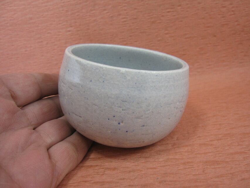 陶器の揺れる(ロッキング)ロックグラスです.ブランデーグラスでもいいかと思います.釉薬は薄い青で,飲み物の色にあまり影響しないはずです.ガラス・クリスタルとは明らかに触感の違う陶器っぽさをお楽しみください.