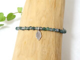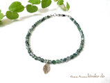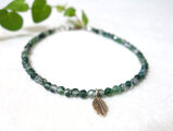 リーフをモチーフにしたカレンシルバーをアクセントに、苔模様が印象的なモスアゲートをつなげたグリーンカラーの天然石アンクレットです。モスアゲートは小粒ながらもひと粒ひと粒表情が異なります。自然が生み出した世界に一つの美しい芸術的な模様をお楽しみください。