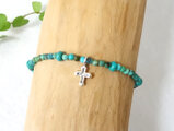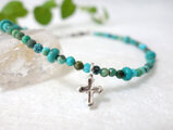 クロスをモチーフにしたカレンシルバーをアクセントに、カット面が煌めく天然色のターコイズをつなげたアンクレットです。爽やかなグリーンカラーに原石由来の模様が混じるターコイズは粒毎に色や模様が異なり天然石ならではの味わいがあります。