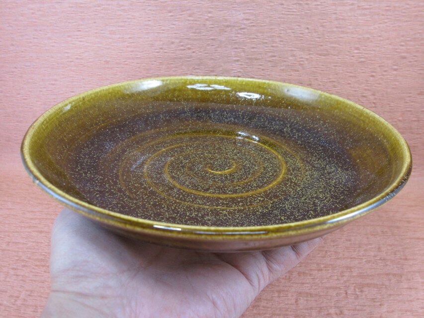 「やや深め」の作品よりはやや浅めの中皿ですが,ほぼ平らなお皿よりはしっかりフチが立っています.斑点が薄めに散った,そば釉単味で仕上げました.指跡の渦巻きが見え,裏側は段々に削ってちょっとおしゃれをしています.