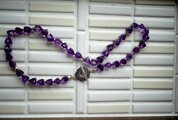 一辺8mmの三角錐の形をしたアメジストをシルク糸で結びながらつなげていったネックレスです。