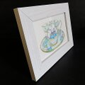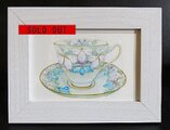 透明水彩で描いた「花柄のティーカップ」の原画が額に入っています。