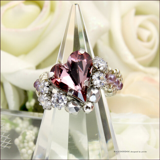 ビーズ,リング,コスチュームジュエリー,ビーズアクセサリー,ビーズリング,♡,紫,バイオレット,ピンク,スワロフスキー,ハート,ジルコニア