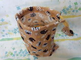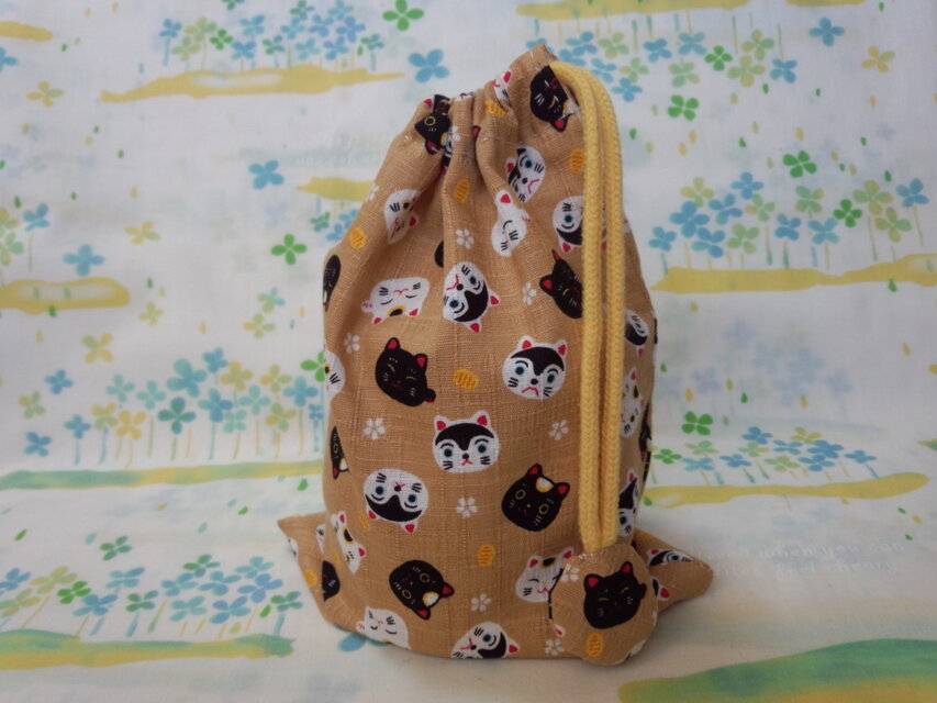 ◆手縫い☆巾着袋☆和柄ねこ・黄土色☆結目カバー付き☆20㎝×15㎝☆給食袋☆コップ袋☆おむすび袋