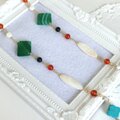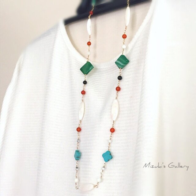 選んだストーンはホワイトシェル、グリーン縞瑪瑙、マザーオブパール(白蝶貝)、オレンジ色が美しいカーネリアン、マグネサイトターコイズのフラワー、グリーンゴールドストーン・・・丁寧に14kgfワイヤーで紡ぎました