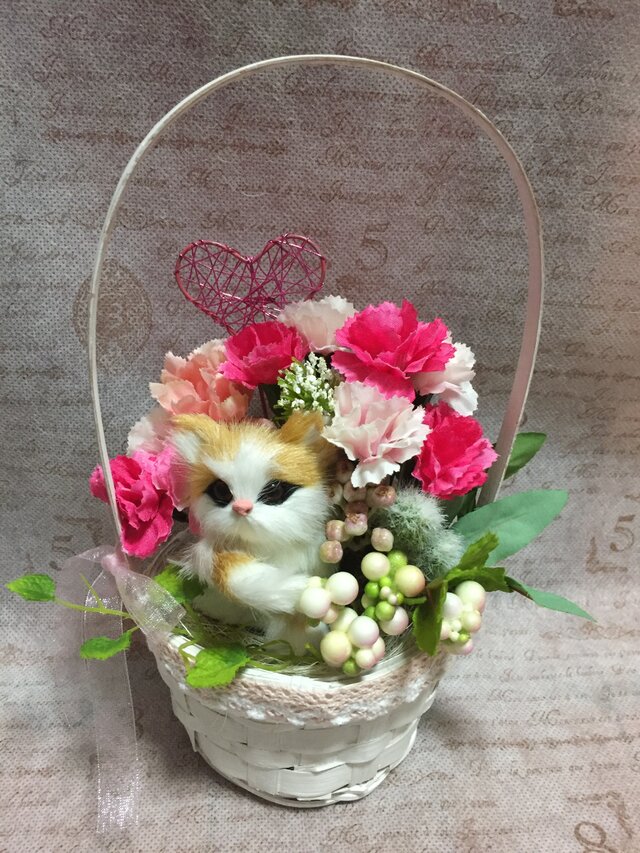 こちらは小さめのかごに猫ちゃんとアートフラワーのカーネーションで母の日用ギフトにアレンジいたしました。