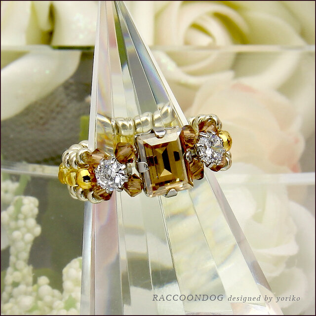 ビーズ,リング,コスチュームジュエリー,ビーズアクセサリー,ビーズリング,ゴールドシャドー,クリア,透明,クリスタル,スワロフスキー,スクエアカット,ジルコニア