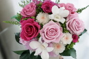 濃淡のピンクのローズに小菊と白いデンファレのアクセントが印象的なアレンジ。