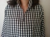 少ししっかりしたコットンギンガムチェックです。ドルマンスリーブにして袖口を二重にするなど、上品さをだすよう工夫したデザインになってます。