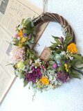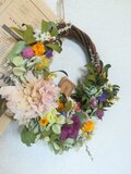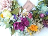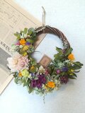 味わいのある色合いのマーブル模様のカーネーションと、薄い花びらが幾重にも重なった豪華なお花のラナンキュラス、千日紅、ヤマブキ、あじさい、キンポウジュなどをアレンジしたナチュラルなリースです。
