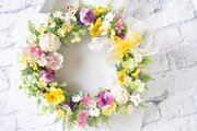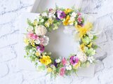 リースサイズ(縦・横・高さ 約 ㎝)27/27/9 リース土台:直径約20センチ リース素材:アーティフィシャルフラワ-(造花):すみれ・アジサイ・スイトピー・小花・ユーカリ、など。自然素材:ソラカーネーション、など。その他:リボン飾り(リース右の黄色いオーガンジーリボン飾りは取り外しできます)、など。