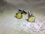 ホワイトがベースのスクエアタイプのベースの中には、本物のイエローのレースフラワーの押し花が入っています。