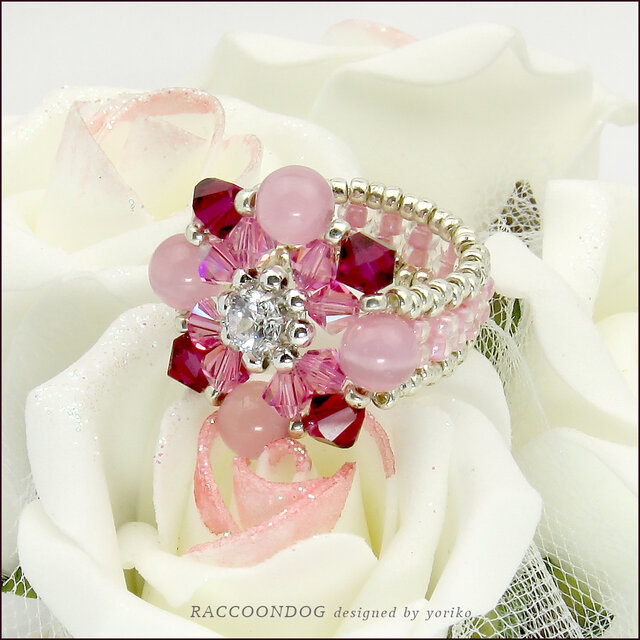 ビーズ,リング,コスチュームジュエリー,ビーズアクセサリー,ビーズリング,花,クリア,透明,クリスタル,スワロフスキー,ギフト,ジルコニア,ピンク,ローズ