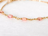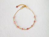 透明感のあるピンクトルマリンが主役のブレスレットです。ピンクトルマリンは中央に8粒とチャームの1粒。中央のピンクトルマリンを結ぶのは小さなインフィニティマークのパーツです。また、ピンクトルマリンは一粒一粒色の濃さが違い趣があります。