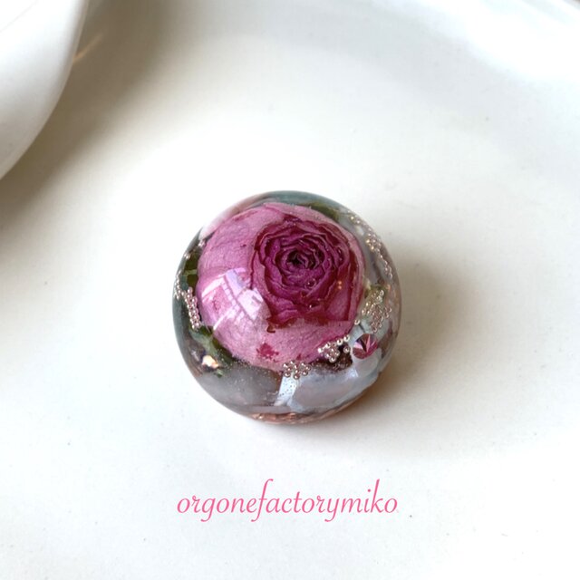 ころんと丸いピンクのバラのドライフラワーが丸いフォルムに可愛いです。