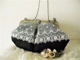 黒リネンにアンティーク刺繍チュールレースをのせたがま口バッグ