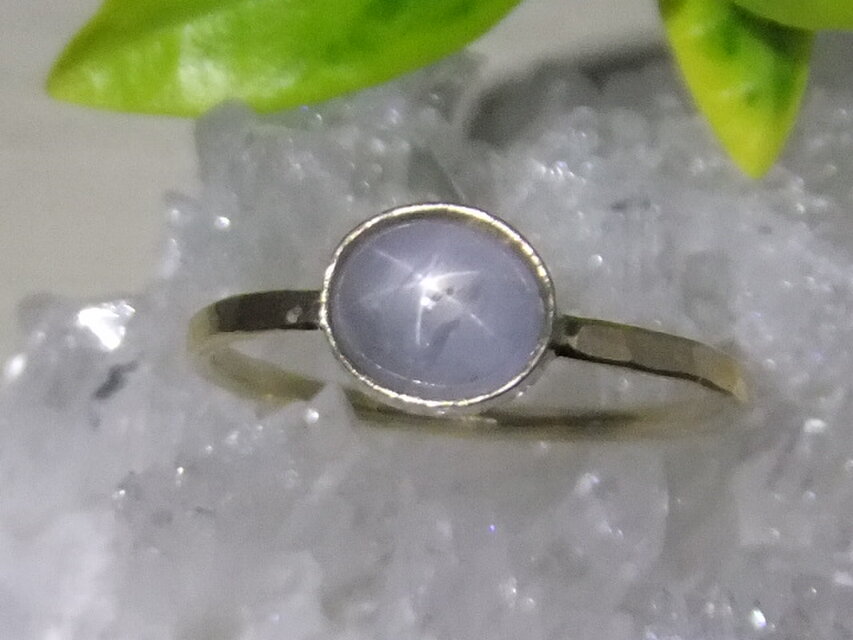 グレイッシュホワイトのスリランカ産スターサファイアをアンティーク調14kgfリングにしました*光源により浮かび上がる六条スターは雪の結晶のようです**幾筋かの境目も見られますが強光でシャープなスターを楽しめる天然石による1点ものです*Yellow14kgf素材から丁寧にリングを作り上げました。。14kgfは真鍮を芯に14金の被覆が施され比較的アレルギーリスクが低く気軽にゴールドの輝きを楽しめるとして人気の素材となっております*リングはアンティーク調を引き立てる鎚目仕上げ、8~15号(推奨サイズ)の範囲を目安に調整可能、サイズ確定後に細かい鎚目の覆輪で石留め致します*